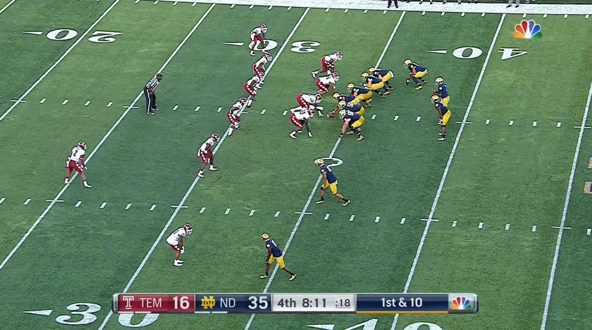 One of the reasons why the 30-sack number on the season isn’t quite as devastating as it seems is largely because of Wimbush’s feet. While he holds on to the ball too long on this particular snap, his agility prevents this from being a much larger loss of yardage.