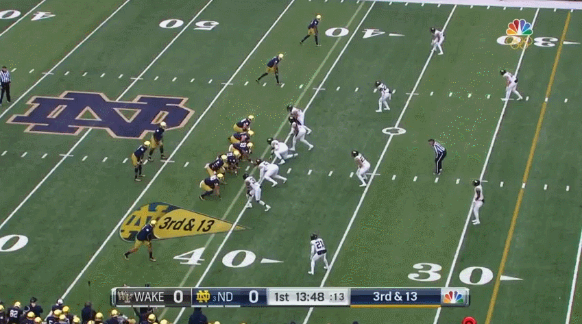Another interesting aspect to this research was how often tight ends were on the field (not unusual) and how often they didn’t block (a bit unusual). From the 30 sacks only one was given up by a tight end late in the Stanford game by Durham Smythe. It’s kind of a chicken or egg argument, but if you’re giving up sacks that means you’re intending to pass the ball which means typically you want to throw to your tight ends. Be that as it may, it might be a good idea for the tight end position to block more on passing downs–if the Irish wideouts can get open.