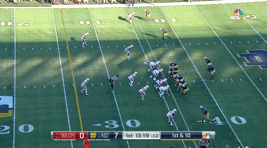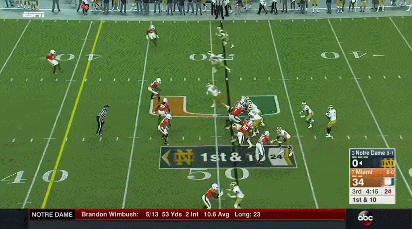 This could be a very hard habit for Wimbush to break because in many instances he’s able to scan the field and still get around the edge to gain positive yardage.