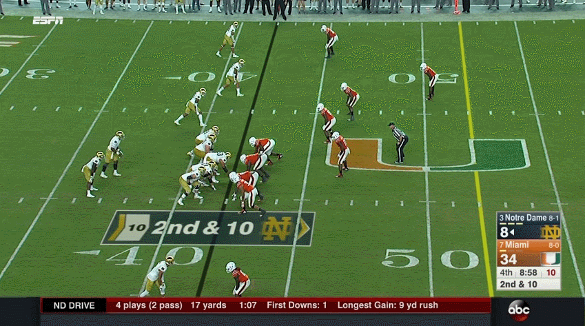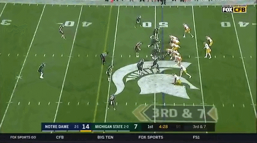 This was a 3rd & long with Bars getting a clean one-on-one battle. He knows pass protection here is super important and has to do a better job giving Wimbush more time to get the ball down field.