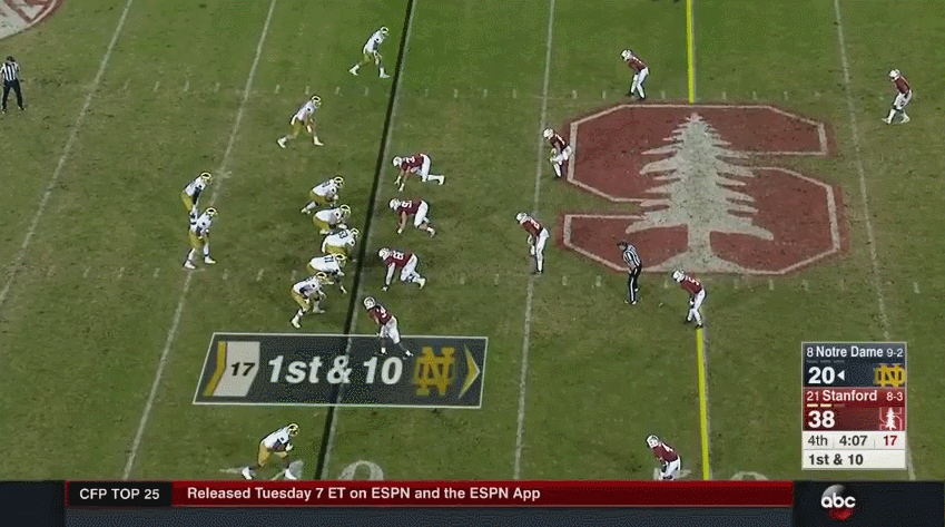 Granted, the Cardinal field is an absolute disgrace and McGlinchey ends this snap completely losing his footing and sliding into Wimbush. But, the initial pass-rush from the end literally takes McGlinchey off his feet.