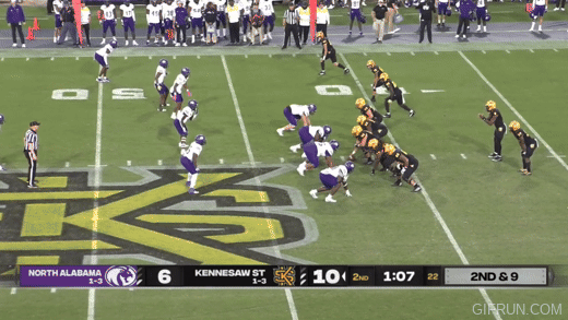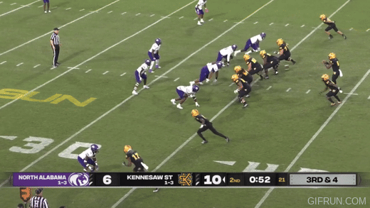 I was looking at Kennesaw State’s 2022 season and zeroed in on their bonkers double overtime win over North Alabama for more good stuff on Chesnut’s passing philosophy. Late in the 1st half, the Owls are running a 2-minute drill and run a 4-wideout play while also sending the running back out, as well. Throwing this deep pass across the field isn’t something you usually see from a triple option team.