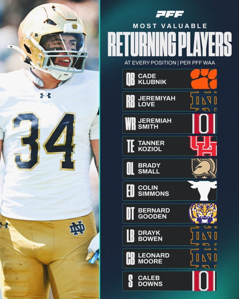 3) But wait! Am I sleeping on rising junior middle linebacker Drayk Bowen? According to the fine folks over at Pro Football Focus I sure am as they have tabbed Bowen as the most valuable returning player at his position. Also featuring Jeremiyah Love and Leonard Moore.