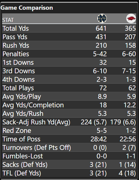 Their two biggest plays of the day were on drives that did nothing else and just allowed them field goals. Final drive of the half 20yds on one play, fumble. ND answered all 6 of the Razorback possessions with touchdowns.