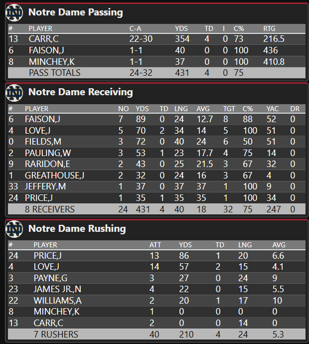 Usually when you see 3 passers in a game things either went really well or really poorly. We saw Kenny Minchey throw an absolute dime for 37 yards and Jordan Faison threw a beautiful ball on the fake punt, too. What a great day for Notre Dame throwers.