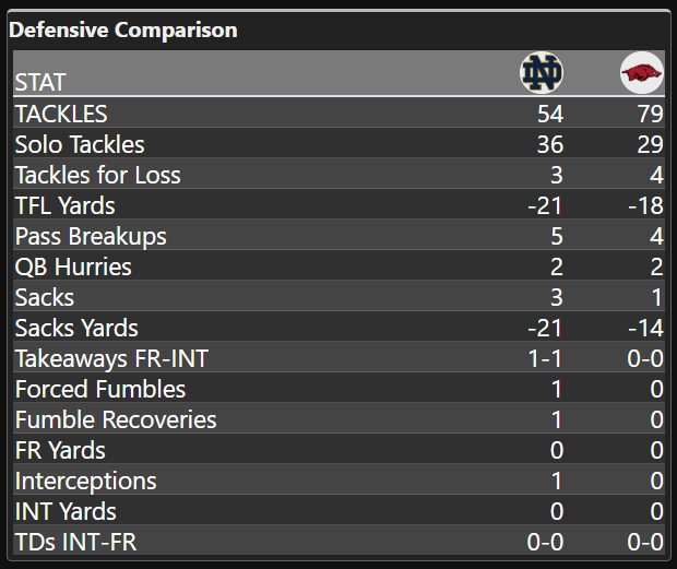 Kinda like last year’s defense when the other team got an occasional big play or sustained a drive…ND clamped down at the end and/or caused a turnover. On the 3 scoring drives Arkansas went 27 plays for 173yds…about half their offense. In between those three were two 3 and outs.