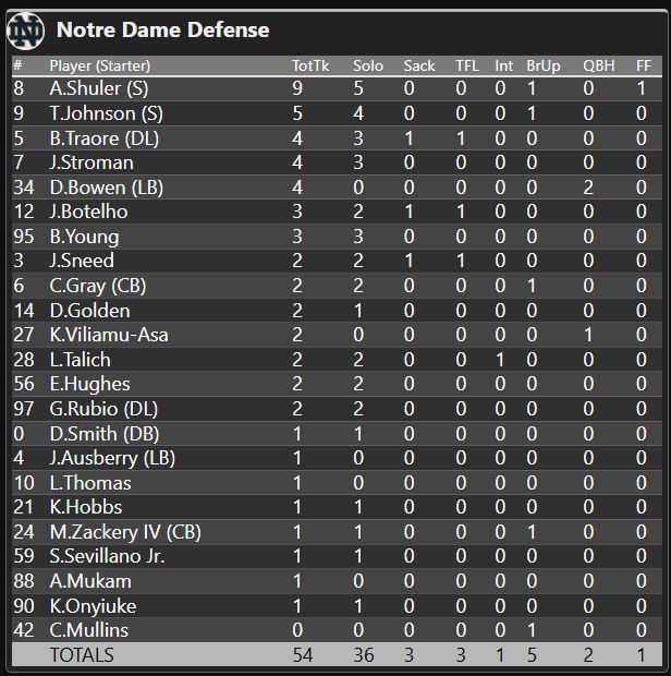 The good news in the game was 3 sacks for the defense, two of them coming from the line. However, it seems that they are contractually obligated not to pick up any other tackles for loss. Just 13 total tackles for loss through 4 games is craziness. The Irish were 131st nationally coming into the weekend and might be dead last by Sunday morning.*