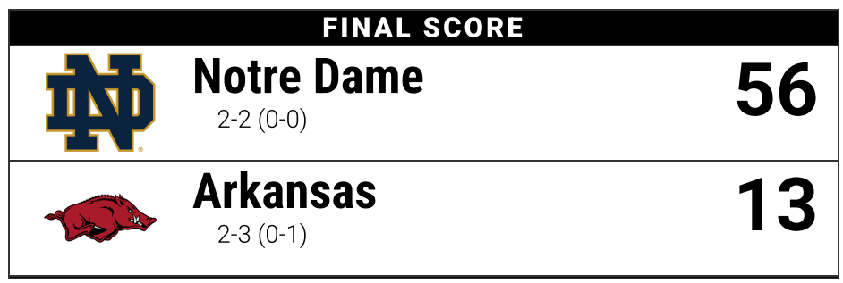 Notre Dame went down to Arkansas this Saturday with the thought its offense might have to score on every possession to try and win the game. That ended up not being necessary but the Irish offense obliged anyway. It was a tense game for about 20 minutes before this game got ugly quickly in favor of Notre Dame.