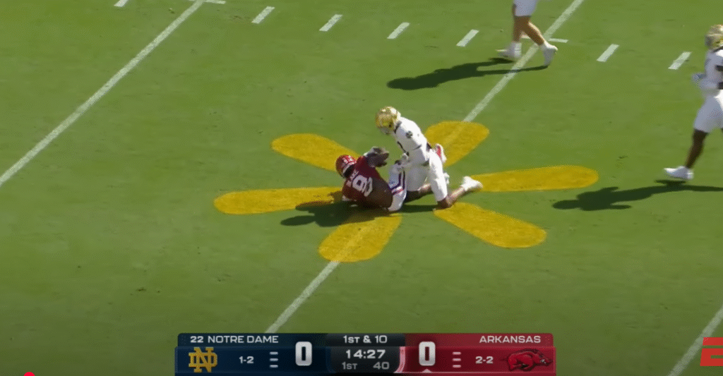 Hey, things looked much better in the secondary! The Hogs were throwing the ball all over the place in their first 4 games and were licking their chops against this wounded and confused Irish secondary. Leonard Moore was still out with injury but nickel corner DeVonte Smith returned to stabilize what became one of the weakest positions on the entire roster.