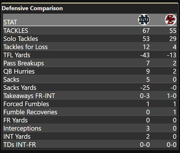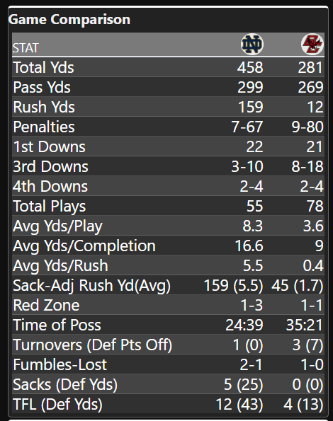Boston College had 12 rushing yards, allowed 5 sacks, and their quarterbacks were under pressure constantly.