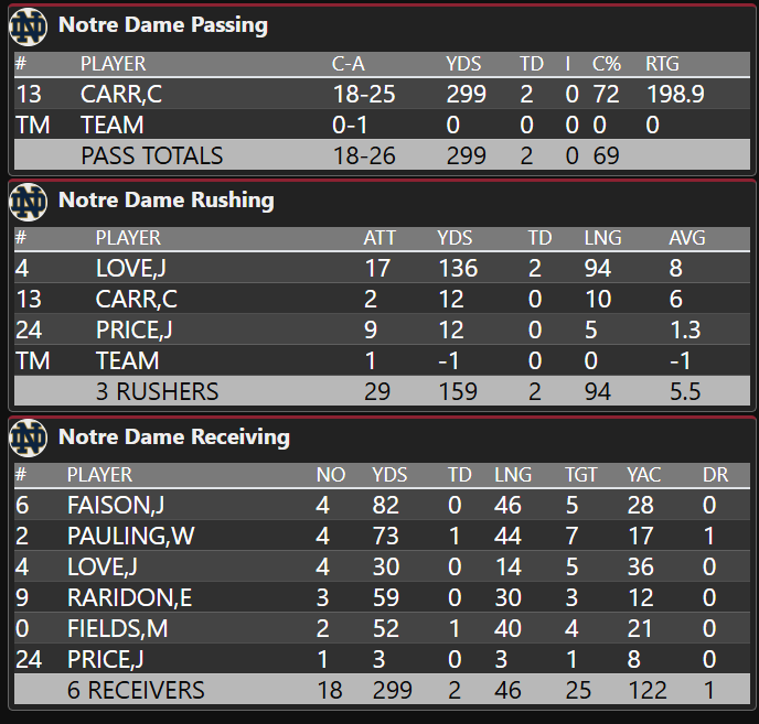 Not much could be said about this game in a glowing light, I can’t lie. However, CJ Carr had a sneaky very good game and a nice bounce back from his struggles before the bye week against USC. They started out chucking the ball on the first drive, it didn’t go very well, then he settled down thereafter. The stats are there, no doubt. An important bit from this game is that Notre Dame’s ground game (outside of that Love touchdown run) provided no explosiveness. Carr’s 1st quarter run to the right for 10 yards was the second longest run of the game for the Irish!