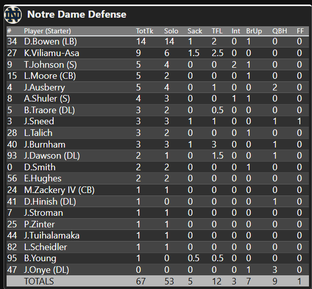 Drayk Bowen with 14 solo tackles, that has to be the highest number for an Irish defender in quite a while.