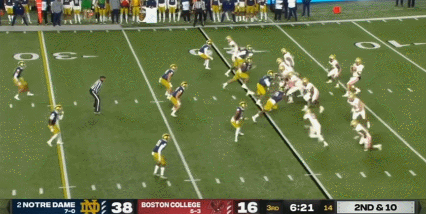 I am still shocked that Boston College ran a simple running back dive on 4th & 1 after a timeout from the Notre Dame 9-yard line. This was on their first drive of the second half while trailing 31-16. I get wanting to go for it but how you don’t at least put the ball in Jurkovec’s hands with the option to run or pass seems crazy to me.