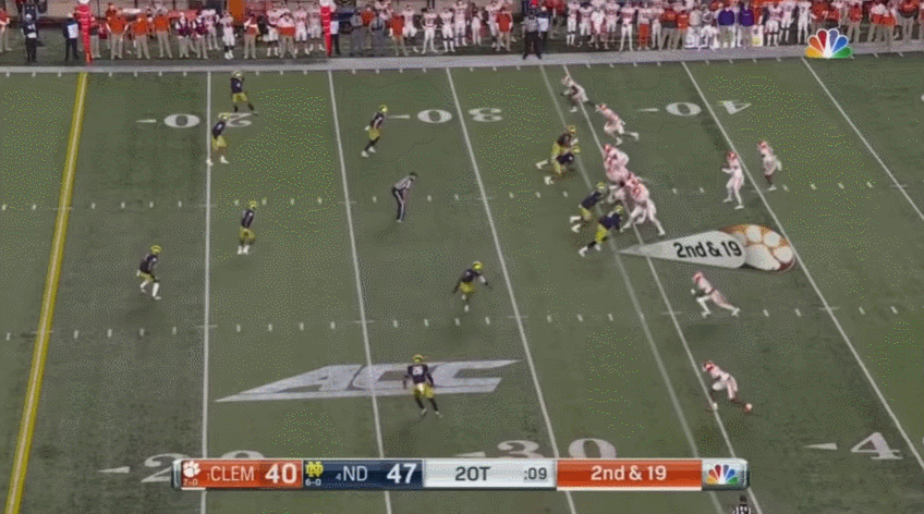 Most of the night, Notre Dame struggled to defend Clemson’s senior trio of Etienne, Amari Rodgers, and Cornell Powell through the air. They combined for 22 receptions for 352 yards, which seems absurd but in a weird way never felt truly that bad.