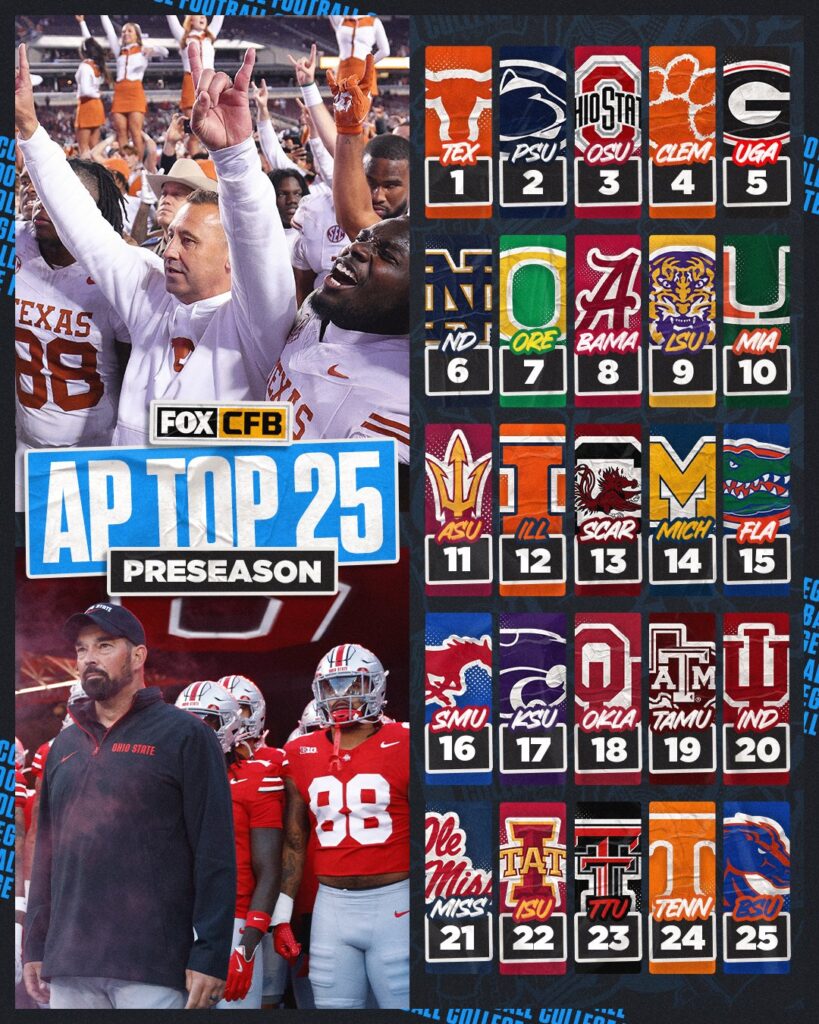 4) The 2025 pre-season AP Poll came out this week. How did it differ to the 18 Stripes rankings and what teams are overvalued or undervalued heading into the season?