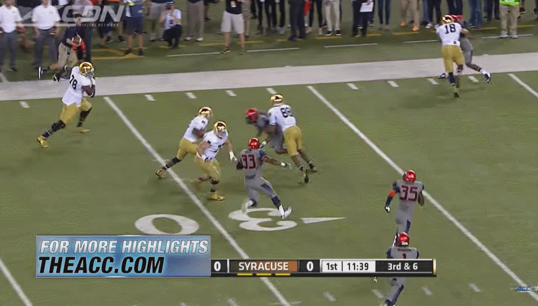 The ACC officials reviewed the play and reversed the decision. In the scorebook it went down as a -3 yard rush and fumble lost by Everett Golson. Syracuse would take over with 13 seconds left and would promptly take a knee into halftime. Notre Dame threw away at least 3 points in this episode but it wouldn’t really matter too much in the end. Plus, it allowed the streak to continue!