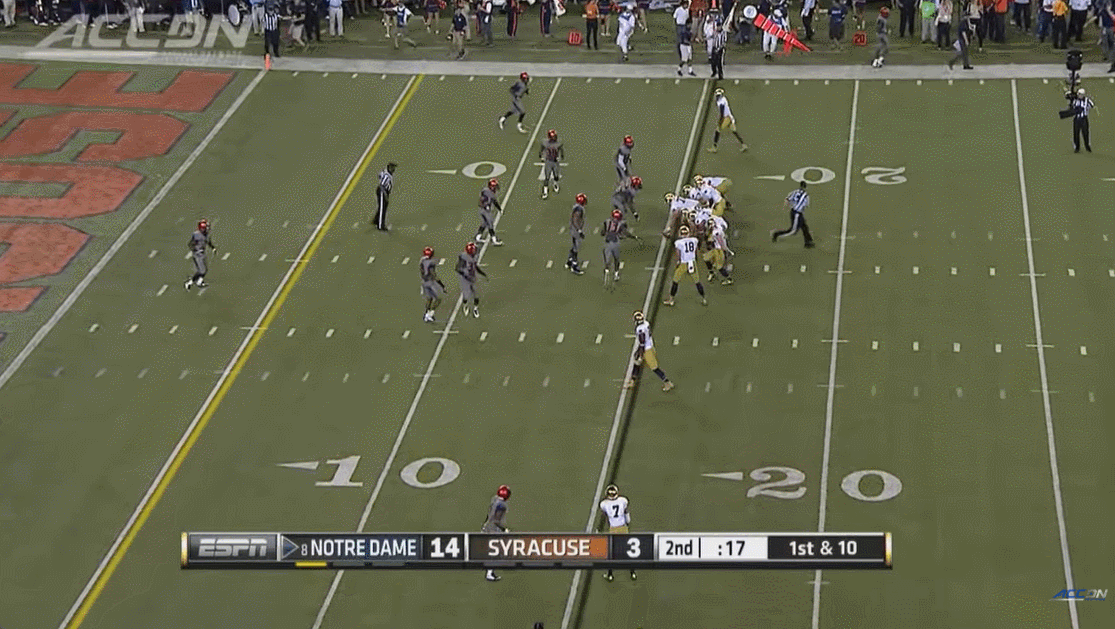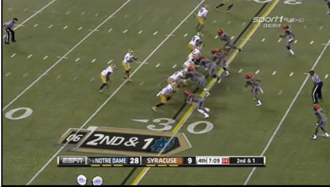 That confusion festered in large part because just 2 plays later one of the weirdest snaps in recent Notre Dame memory happened. Closing in on the end of the 1st half, Golson threw the laser to Chris Brown for 23 yards to bring the ball to the Syracuse 15-yard line. With 1 timeout in their pocket, the Irish hurried to the line and tried to spike the ball.