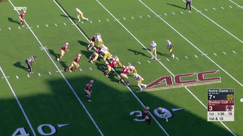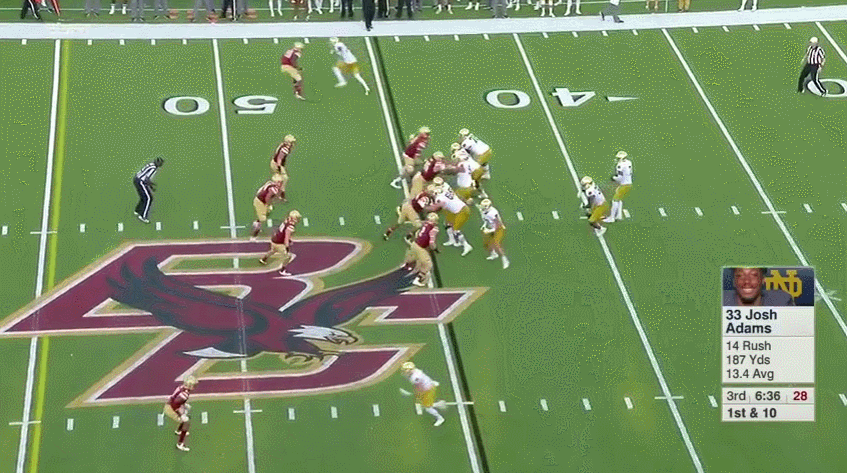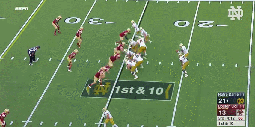 The Scene: Notre Dame opens the second half with a pair of 3 & out drives sandwiched in between a punt of their own by Boston College. On Notre Dame’s said second punt (the rugby one from above) BC returns it 13 yards to their own 46-yard line for excellent field position.