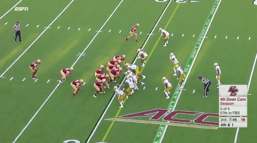 Following a completion from Brown the Eagles were quickly in field goal territory but a few plays later found themselves in a 4th & 1 situation from the 30-yard line. Instead of a long-ish field goal and the possible 2-point lead BC decides to go for it and gets stuffed by Nyles Morgan and Te’von Coney. Both Daelin and Trumbetti aren’t even set but true freshman Myron Tagovailoa-Amosa absolutely blow this play up.