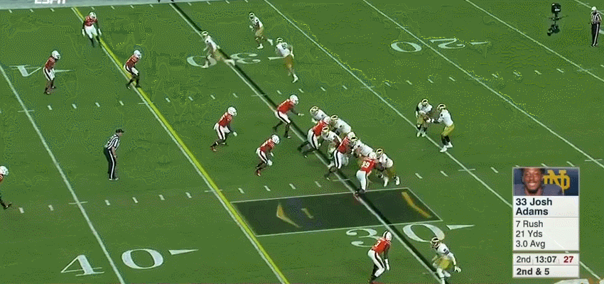 Upon re-watching the game (very quickly) I didn’t think the run game was set up that poorly or the gameplan looked out of sorts. When healthy Adams has been carrying the ball around 18 times per game and the Irish gave the ball to him 15 times in the first half. The vast majority tried to hit Miami in between the tackles.