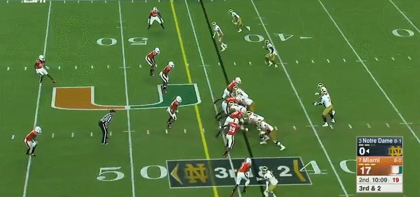 The Canes only finished with 43.5% success rate but ripped off enough medium-to-long runs to total a healthy 237 yards. Four out of Miami’s 7 successful carries in the first half came from Rosier. Once the Irish adjusted, Homer was able to get some nice runs in the second half.