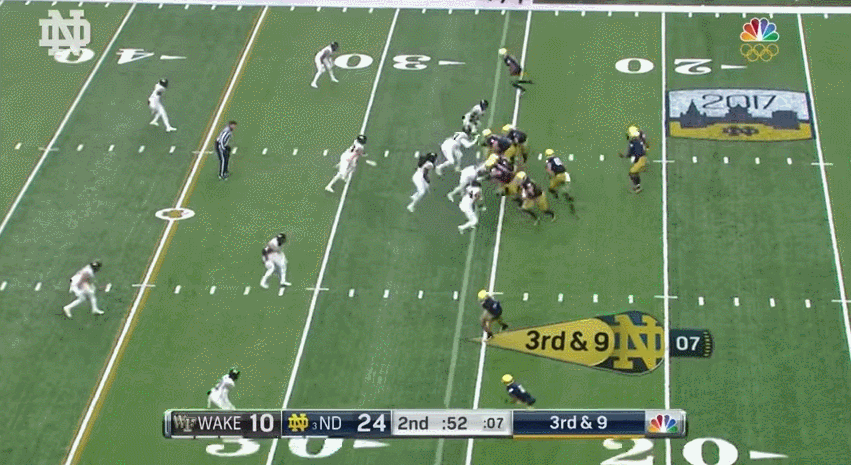 Clearly, the Wake Forest tempo bothered Notre Dame and their first 3 out of 6 drives were pretty solid even if they only scored 10 points. They ran 88 plays (tied for the most since the Syracuse game last year) in just 28:07 time of possession. The previous fastest moving offense this year was Boston College and they had a snap every 21.4 seconds of possession. The Deacons beat that with a snap every 19.1 seconds.