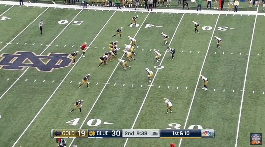 On an overcast South Bend afternoon the Blue (offense) team defeated the Gold (defense) team 47-44 in another edition of the Notre Dame spring game. As per usual, they jammed in a whole slew of plays at a blistering pace (123 from scrimmage) even with running 12-minute quarters in the second half. Many plays, a lot to see, and since it’s the spring only a little bit to take away.