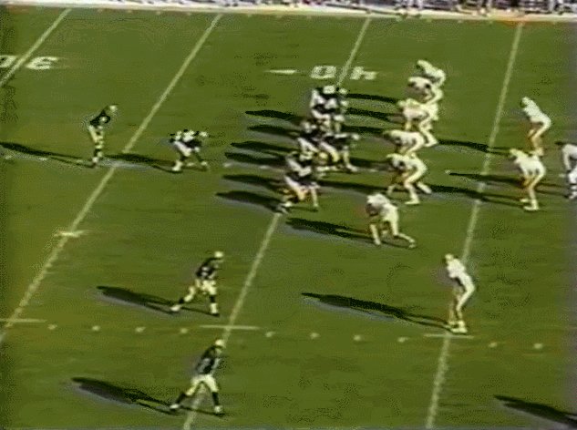 As Lou Holtz was want to do, the Irish opened the second series with 4 straight successful runs (39 total yards) all against even numbers in the box–he was always so good at adjustments. Florida State then adjusted themselves for the first time adding an extra defender in the box, Notre Dame flexed out tight end Oscar McBride, and McDougal (gasp!) checks to a pass play!