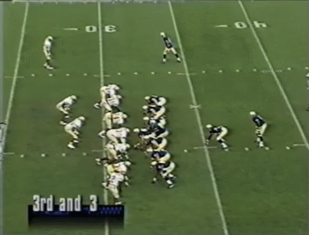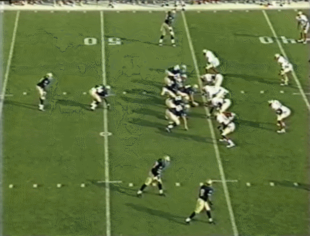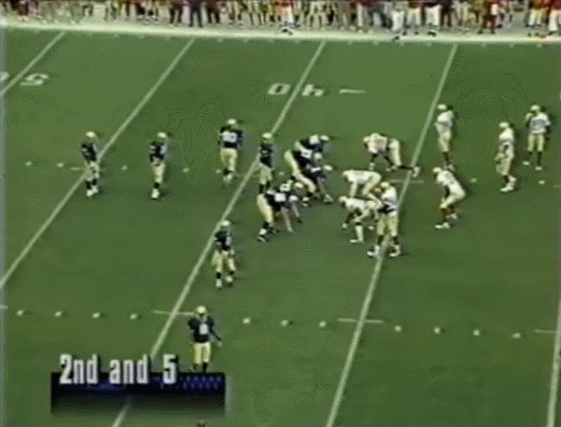 I brought up the 1993 Florida State game above and was interested in looking at things from perhaps the best Irish victory over the last 3 decades. Notre Dame played the vast majority of the game in I-formation alternating between 2 and 3-receiver sets as the offense continued its move away from the triple option reliance of the late 1980’s. On the first offensive series the numbers are even in the box and the Seminoles eat things up led by linebacker Derrick Brooks.* Runs of 0, 2, and -1 yards predict a mighty struggle on the ground to come.