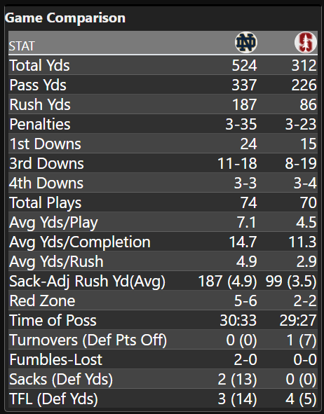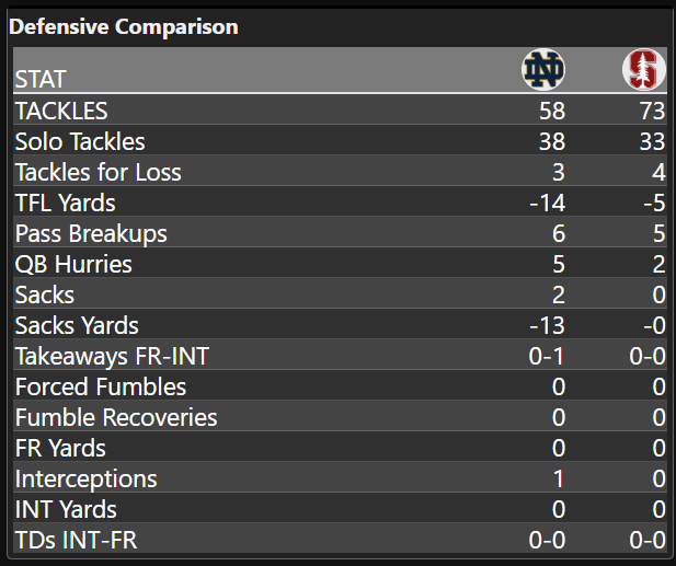 Stanford hasn’t allowed a ton of rushing production in 2025 and no one will look at what Notre Dame did on Saturday night and be in awe. Still, the production was among the best the Cardinal have allowed this season and the Irish offensive line did a very good job in pass protection to keep the offense free from any sacks. Any time you don’t give up a sack with only 4 tackles for loss is a good day in the office.