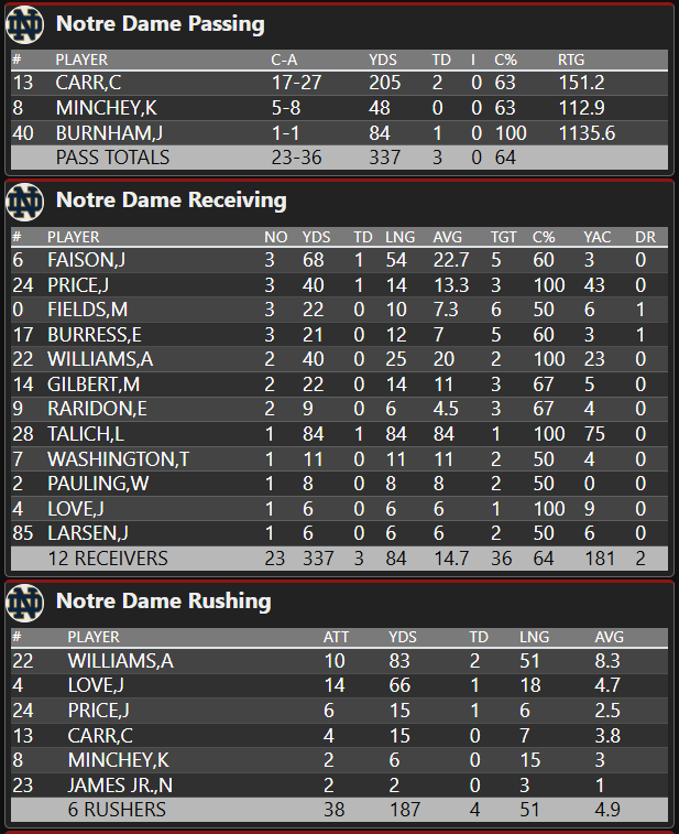 Another fine and competent performance from CJ Carr who ends his first regular season with Notre Dame with the following stat line: