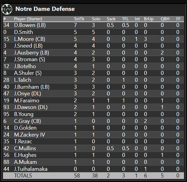 Nothing fancy or dominant up front from the Irish–just a solid game all around. With only a pair of sacks, backup Cole Mullins was the only lineman to get on the scoresheet (0.5 sack) from this unit.