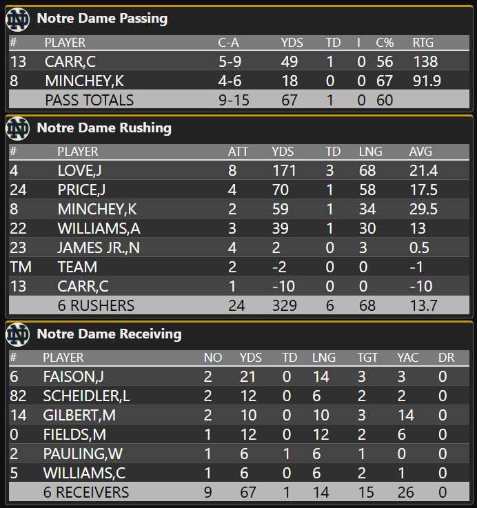 We’ll have to check the record books but 339 non-sack rushing yards on only 23 carries is absurd, that’s hard to do on easy mode in a video game! The Irish almost averaged 15 yards per rush! And that includes some late Nolan James runs that didn’t do a whole lot.