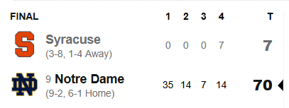 With the score sitting at 21-0, in the gameday Discord channel I joked Notre Dame should cover the spread in the first quarter. Wishes do come true this Holiday season, I guess. On an overcast afternoon in South Bend, the visiting Syracuse Orange showed they did not belong on the same field as the Fighting Irish resulting in an embarrassing 70-7 loss for one of the nation’s most struggling football programs. I’m not sure we’ll classify what transpired as ‘fun’ but it was another obstacle passed on the way to the post-season. For the finale, Notre Dame will travel to California to face Stanford.