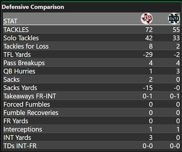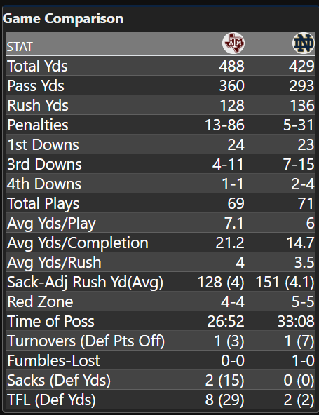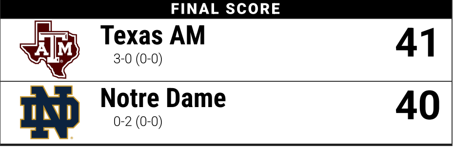 Math nerds may be able to confirm, but I believe the odds of Notre Dame winning would’ve been better if A&M had 4th & 6 with 39 seconds remaining (assuming Gray’s man catches the ball and isn’t held) and/or they score with more time remaining on the clock versus a fresh set of downs with 39 seconds remaining at the Irish 10-yard line.