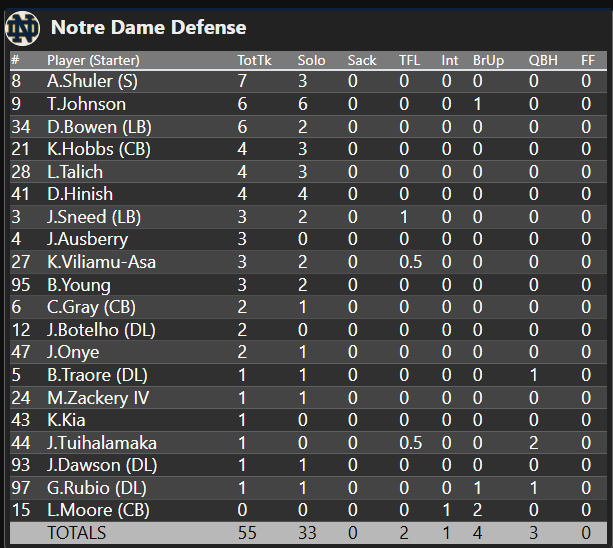 A low bar to be sure, yet the linebackers were the best unit on the field for Notre Dame. Curiously, Jaylen Sneed didn’t see the field a ton (22 snaps, fewest among the “regular” on defense) as the defense looks to coalesce around Drayk Bowen and KVA at linebacker. We were told about an impending breakout season from the media for Sneed but he’s never played regularly in this type of every down role and perhaps it’s just not going to happen.