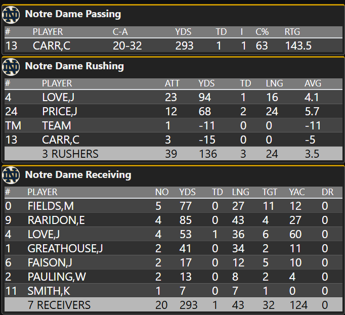 Maybe it’ll get lost in the 0-2 meltdown that is happening for Notre Dame. I’ve been so impressed with CJ Carr this season so far. Nearly 300 passing yards speaks for itself and I don’t think it’s difficult to understand what has made Carr one of the more promising players on this team already. He’s wise beyond his years, commands the offense really well, has shown the ability multiple times to be able to go through his progressions without panic, and he’s a very accurate passer with upperclassman decision making.