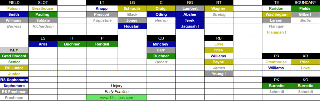 Last year, someone mentioned creating the depth chart with player numbers. Ya boy hasn’t forgotten. I’ve removed the colors by eligibility and added in player numbers. There’s a link to a PDF you can print down below to show your friends and learn the roster better without the nameplates on the jerseys.