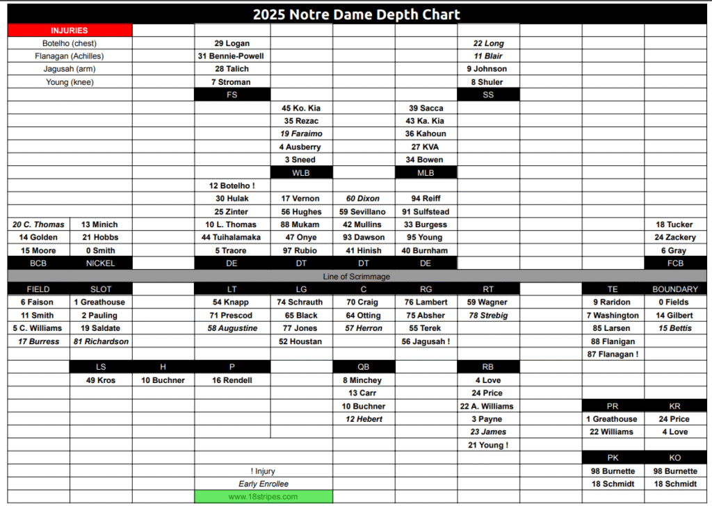 These things matter a little less in the Roster Era of college football but it was curious that Notre Dame decided to carry 6 running backs this year. As it worked out, the loss of Young for the season opens up an opportunity for freshman Nolan James who is reported to have had an excellent camp. Perhaps a redshirt will not be in the cards for James, particularly with Notre Dame set to lose some veteran tailbacks after 2025. They might want to get him ready sooner rather than later.