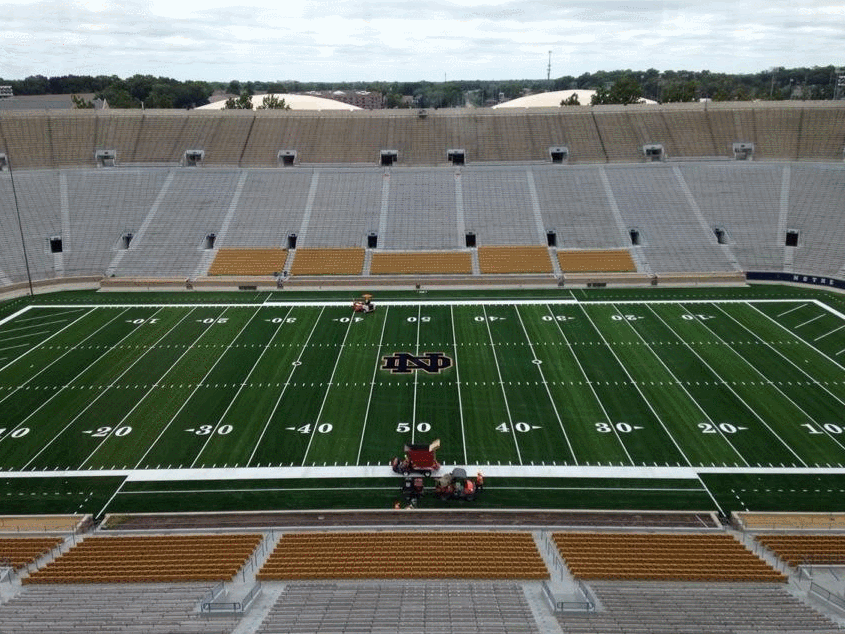 Notre Dame’s new field turf–the second synthetic surface laid down since 2014–is now installed. They have gone back to a smaller, skinnier yardage markers last seen in 1997.