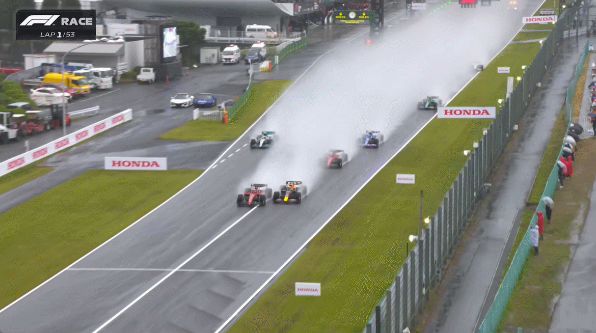 If you wanted confusion, anger, and exasperation to complete a race and crown a champion F1 has you covered! The sport dealt with mostly wet practice sessions in Suzuka before a dry qualifying saw Max Verstappen barely edge out Charles Leclerc and Carlos Sainz for pole position. However, the heavens opened up again for Sunday’s race, and despite fears from many, the cars blasted through the rain on inter tires with Verstappen holding on to the lead through turn 1 in a brave and aggressive move against Leclerc.