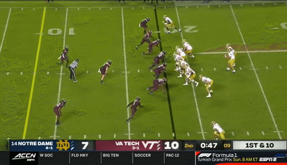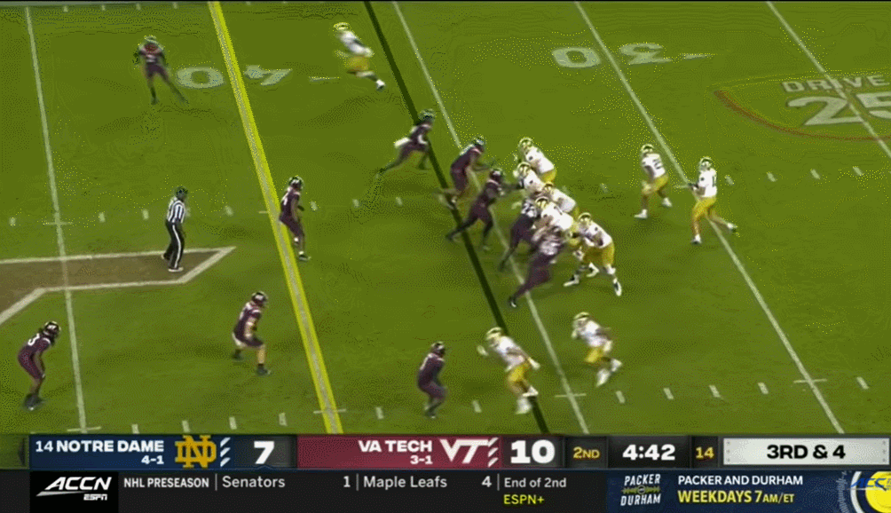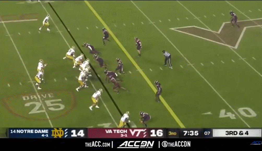There are 4 more throws I want to highlight. First, this flag route to Davis coming out of the slot yet again versus Virginia Tech: