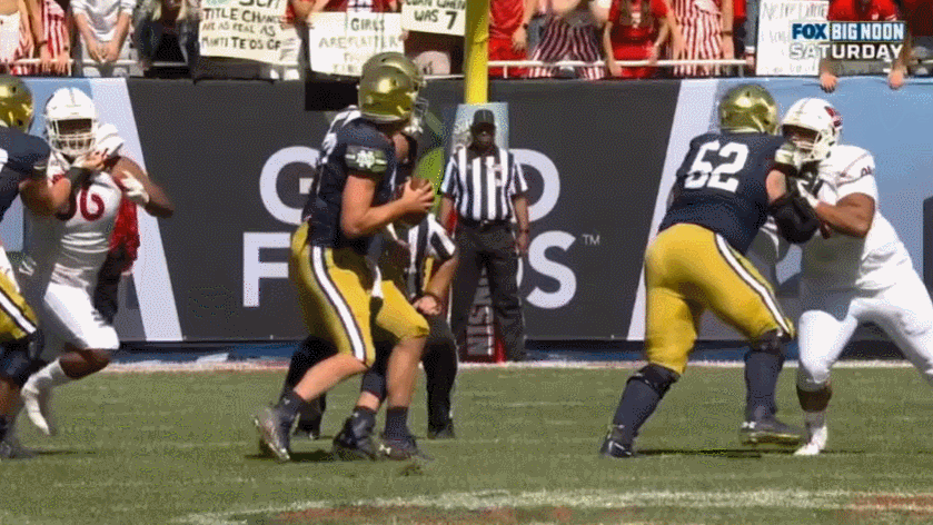 After the game, Brian Kelly said Coan is still the starting quarterback (assuming he’s healthy I suppose) which is fine for now. I think Coan has to really look in the mirror and do a better job in the pocket and avoid the turtling like in the above GIF to give the offense a chance. That was on a 3rd & 10 from the Wisconsin 30-yard line with 3.9 seconds worth of protection. Under no scenario should that be a sack against a veteran 6’4″ quarterback. Color guy Joel Klatt highlighted on the replay that Avery Davis came wide open to Coan’s left after his drop, too. You have to stand tall and throw the ball, run, or escape the pocket on a play like this…a sack just can’t happen.